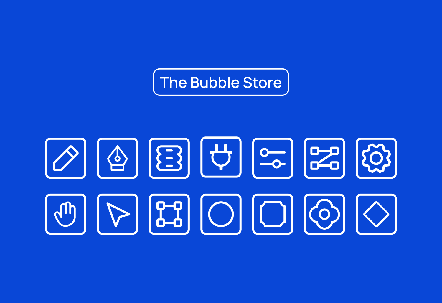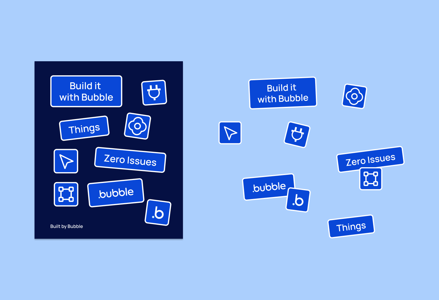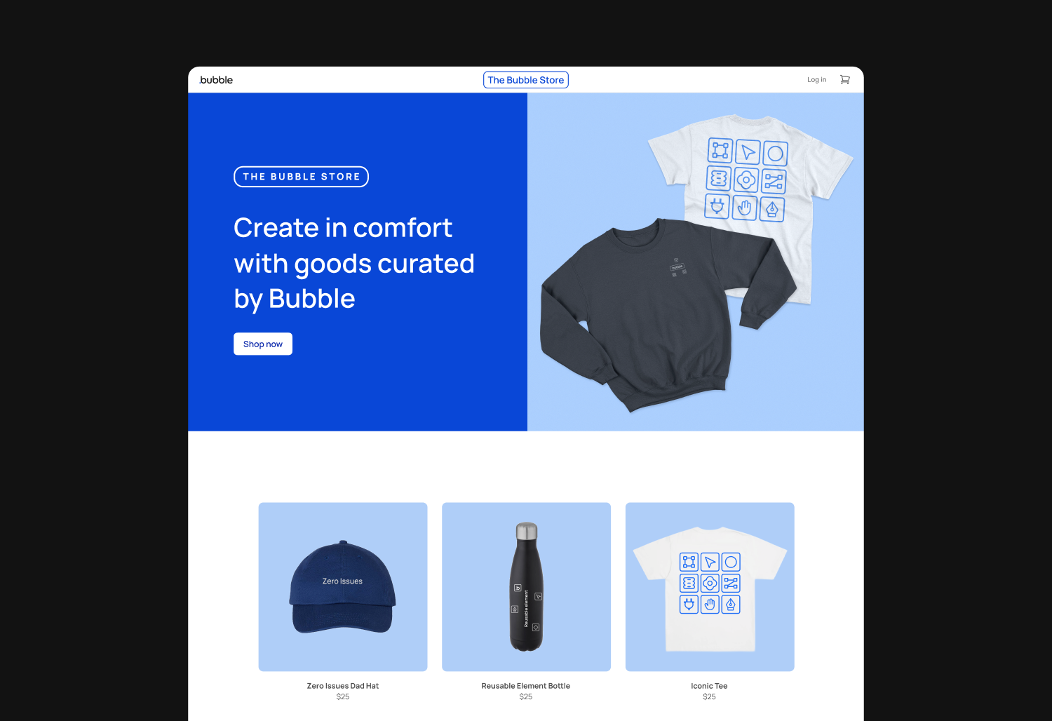 I designed and led creative direction for Bubble’s first ever merch store. It was a huge step for Bubble’s brand awareness as we finally had a physical way to rep Bubble. With over 4 million users, fostering community is valued immensely. I wanted to appeal to the average Bubble user by using language related to Bubble’s visual development language like “Things” for the tote bag, “Hot fix” for the mug and “Reusable elements” for the water bottle. The custom iconography system riffs on the actual icons used in the product itself with a stylistic twist.